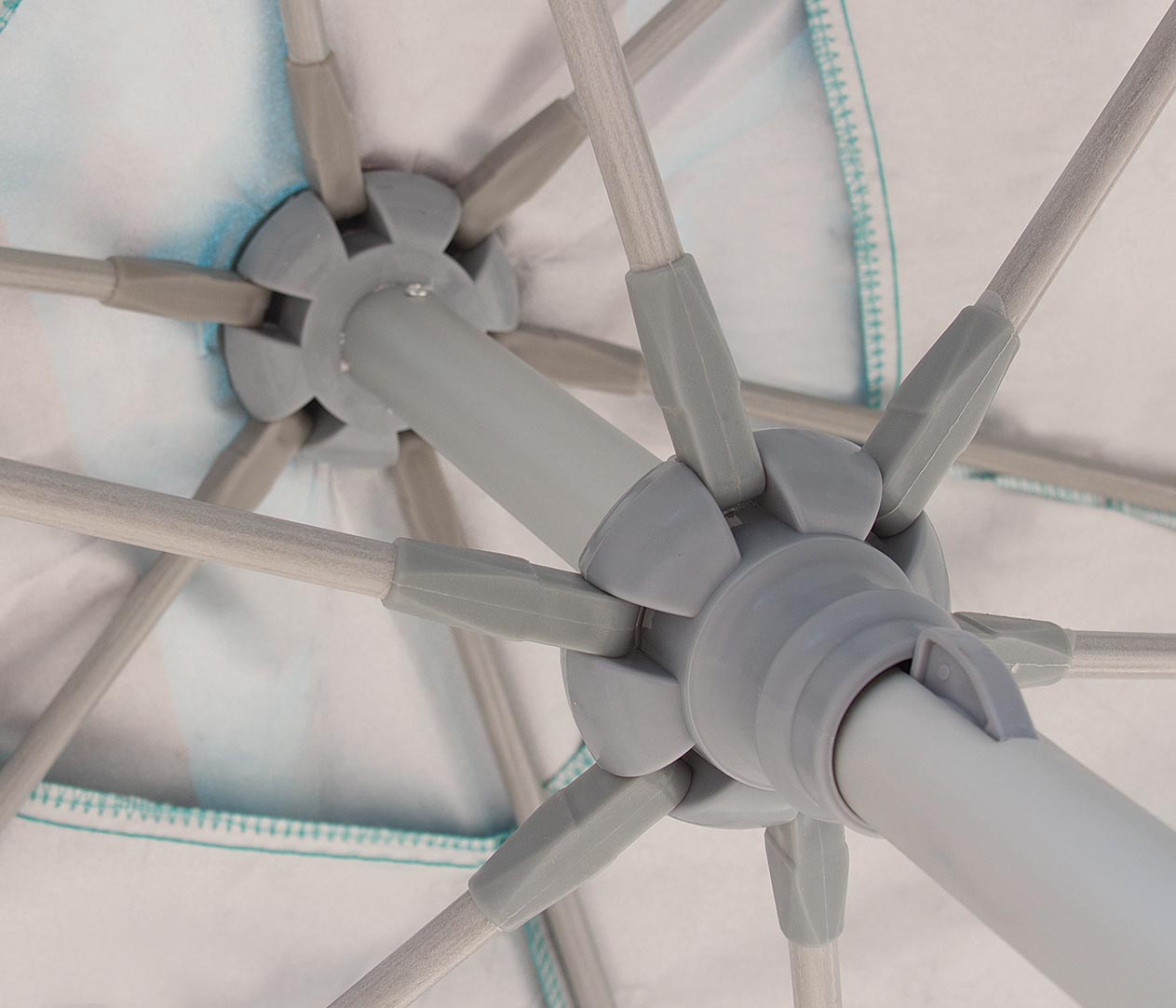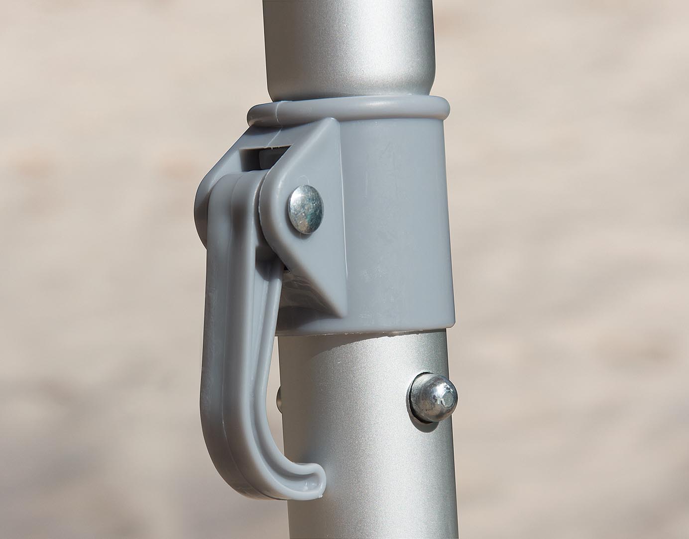 Seu sistema duplo de fixação é outra novidade, com alavanca plástica e pino duplo que garantem maior segurança na junção das duas partes do guarda-sol, evitando que a parte superior se solte com o vento.